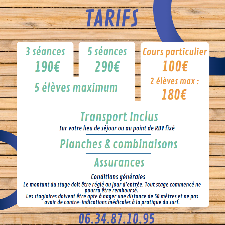- Les stages de surf se déroulent pendant la période estivale et les vacances du Lundi au Vendredi.